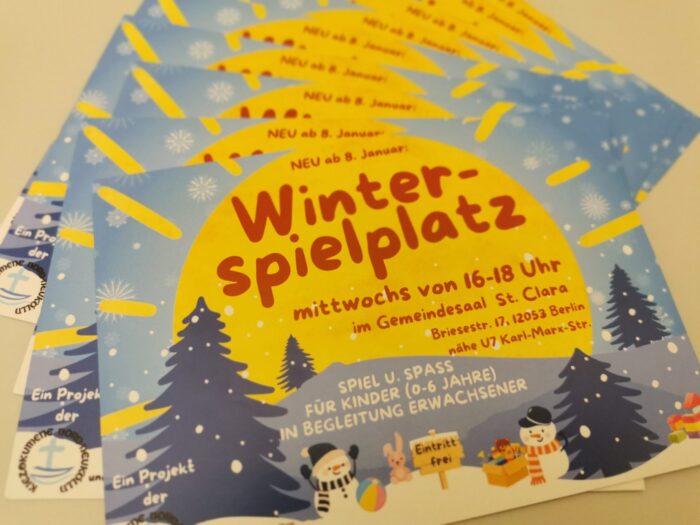 Wenn es draußen kalt, windig und ungemütlich ist, brauchen Kinder dennoch Bewegung und Platz zum Spielen. Die Kirchgemeinde St. Clara öffnet daher ab 08.01. immer mittwochs 16 – 18 Uhr den großen Saal des Gemeindehauses. Als Winterspielplatz bietet der Saal für kleine Kinder von 0 bis 6 Jahre und ihre Begleitpersonen ausreichend Platz für Spiel…