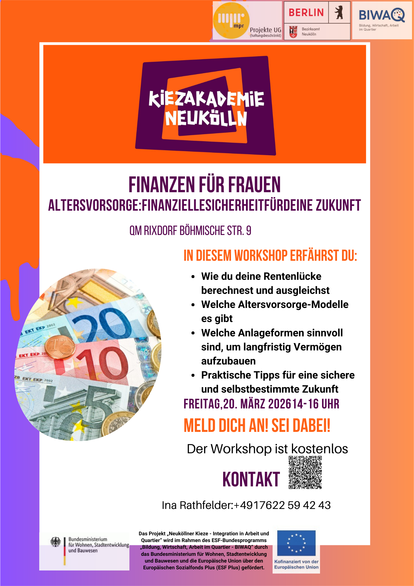- Freitag, 20. März 14-16 Uhr: Finanz-Wissen Workshop für Frauen: Wie gestalte ich meine Altersvorsorge, QM-Büro Rixdorf, Böhmische Str. 9, 12055 Berlin