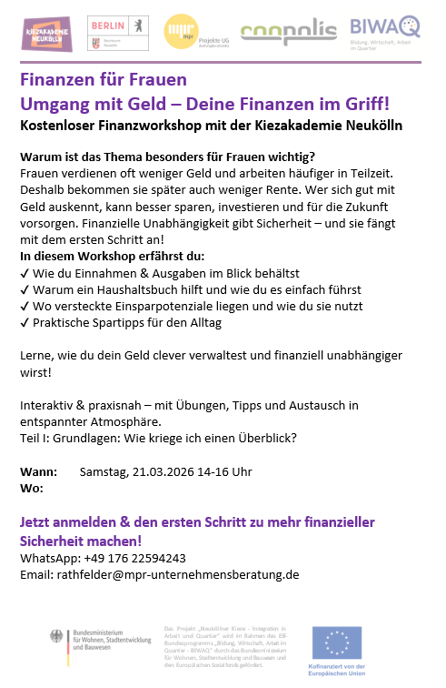 - Mittwoch, 15. April 10-11:30: Finanz-Wissen Workshop für Frauen: Behalte deine Finanzen im Griff und erfahren mehr zu Umgang mit Geld (Teil II), Kiezanker Falkstr. 24, 12053 Berlin