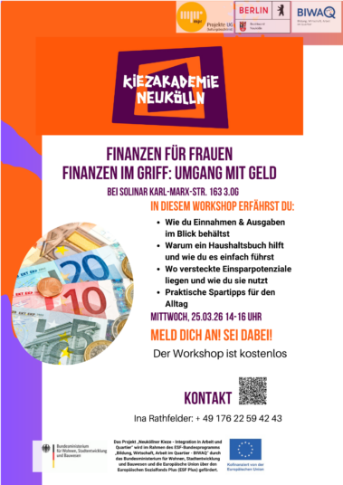 - Mittwoch, 25.März 14-16 Uhr: Finanz-Wissen Workshop für Frauen – Erfahre mehr zu Umgang mit Geld, SoliNaR bei Zebus e.V., Karl-Marx-Str. 163, 3. OG, 12043 Berlin